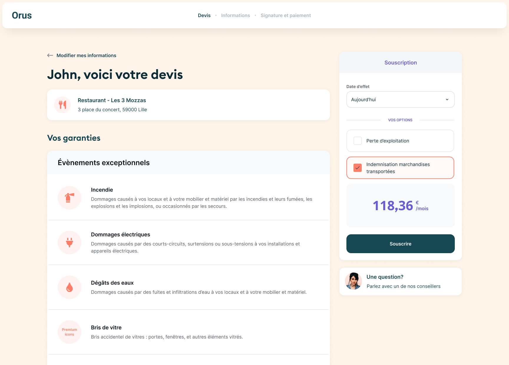 Leur défi était de créer la première version de leur produit, visant à offrir une expérience d'assurance plus fluide et plus accessible. Ils ont sollicité l'expertise de Mozza pour développer une plateforme numérique conviviale, incluant un tunnel d'abonnement et un espace de gestion client, tout en garantissant une efficacité UX optimale dans un délai serré. Ce défi a été renforcé par la nécessité de valider l'adéquation du produit avec le marché, en particulier dans le secteur de la restauration, tout en intégrant Orus dans le processus de recherche utilisateur pour approfondir leur compréhension du secteur et améliorer leurs capacités.